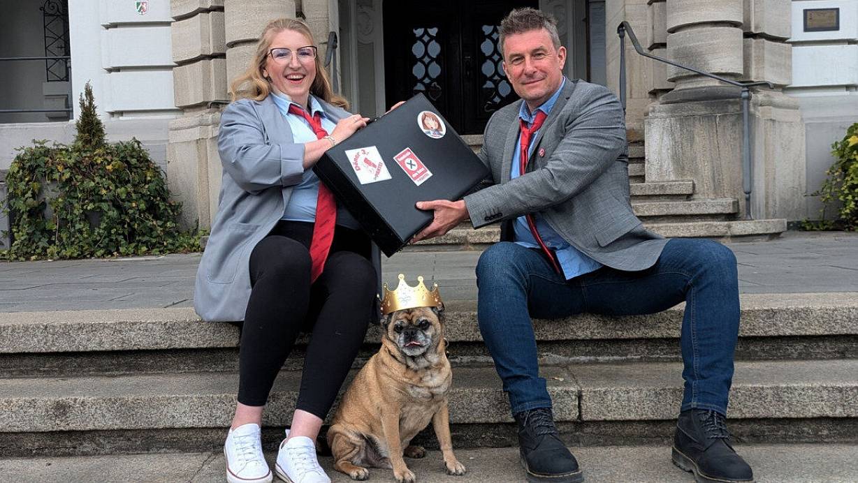 Melanie Amling will für das Amt der Landrätin kandidieren, Stefan Kannegießer für das des Bürgermeisters in Herford. Kannegießers Hund steht symbolisch für die Würde, die "Die Partei" den Vierbeinern verschaffen will, wenn sie ihr Geschäft erledigen, unter anderem mit Musik nach Wahl. | © "Die Partei"