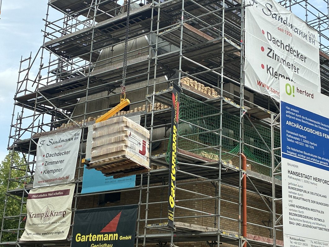 Herford. Lautlos schwebt das Bündel mit den hellgelben Klinkersteinen in die Höhe. Ein Kran zieht das schwere Paket nach oben. Wenig später wird es von Baufachleuten verarbeitet. Das Hauptgebäude des Archäologischen Fensters am Münster (AFaM) bekommt sozusagen sein neues Kleid. Damit verschwindet die optisch sehr wuchtig wirkende Betonkonstruktion des eigentlichen Baukerns aus den Augen der Betrachter. Eine neue, wichtige Etappe beim Bau des AFaM hat begonnen.