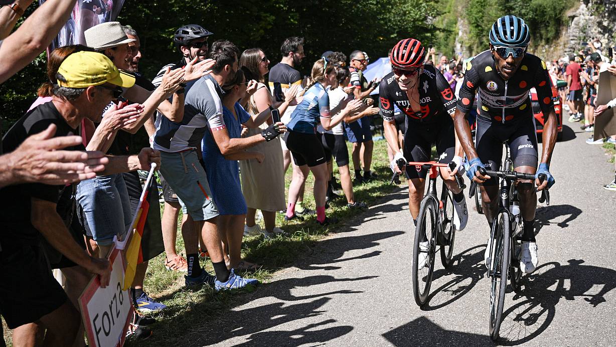 Lidl Deutschland Tour 2024 24.08.2024 3. Etappe Schwaebisch Gmuend und Villingen-Schwenningen, 3. Bergwertung am Traifelberg (Gemeinde Lichtenstein / Landkreis Reutlingen) Marius MAYRHOFERGER (Mitte, GER / TUDOR PRO CYCLING TEAM) mit einem Laecheln fuer seinen Fanclub (li) an der Rampe zum Traifelberg und Dawit YEMANE (re, ERI Team BIKE AID) FOTO: Pressefoto ULMER / Markus Ulmer xxNOxMODELxRELEASExx | © Picture Alliance/Pressefoto Ulmer