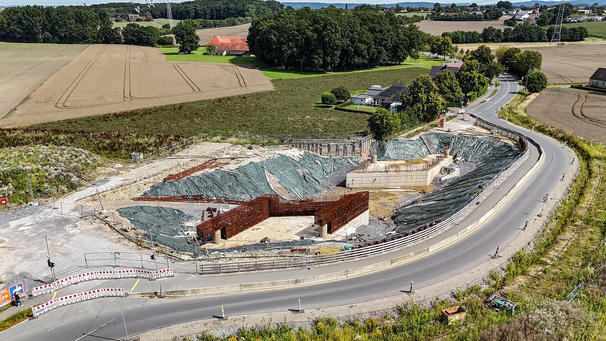 Es gibt Bauprojekte, die unter keinem guten Stern stehen. Dazu zählt wohl auch der Lückenschluss der Ostwestfalenstraße, der Landesstraße 712n. Das rund 2,6 Kilometer lange Verlängerungsstück zwischen Altenhagen und der Herforder Straße sollte mit dazugehöriger Brückenquerung über die Elverdisser Straße bereits im Sommer 2025 fertig sein. Doch anstelle einer hohen Brücke befindet sich an der Stelle ein tiefes Bauloch mit unfertigen, vor sich hin rostenden Stahlbetonfundamenten. | © Stefan Gerold