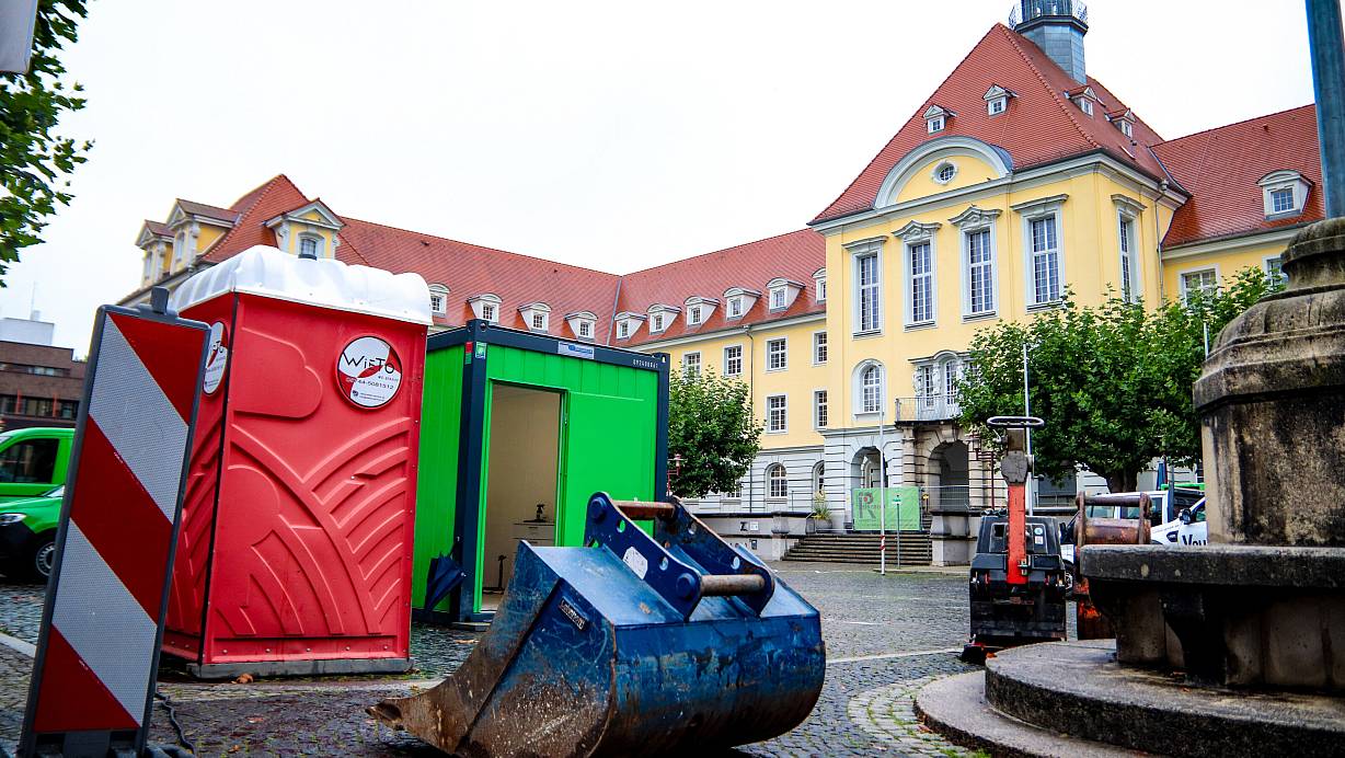 Bauarbeiten am Herforder Rathausplatz: Container und Bagger markieren den Beginn der umfangreichen Umgestaltung. | © Moritz Trinsch