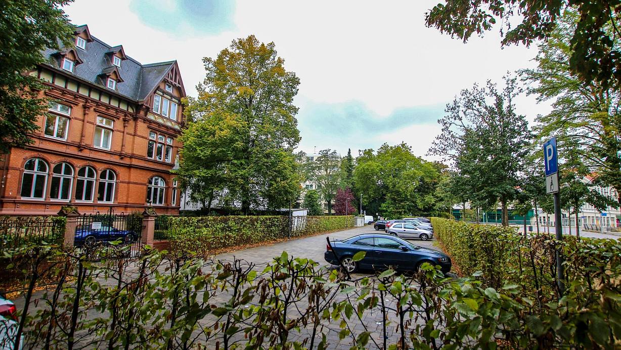 Direkt vor dem denkmalgeschützen Gebäude am Wilhelmsplatz wurde ein Parkplatz errichtet. Sinan Eskici ärgert sich darüber, dass seine Zufahrt "gekappt" wurde und ständig Autoposer auf dem Parkplatz bis spät in die Nacht Lärm machen. | © Daniel Salmon