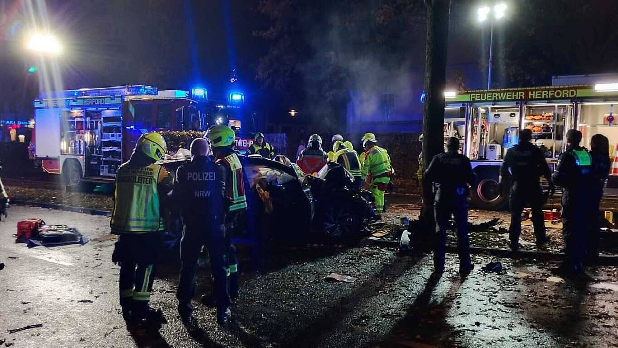 Einsatzkräfte der Feuerwehr und Polizei am Unfallort: Der zerstörte VW Golf nach dem schweren Zusammenstoß mit einem Baum auf der Straße „Auf der Freiheit“ in Herford. | © Claus Frickemeier