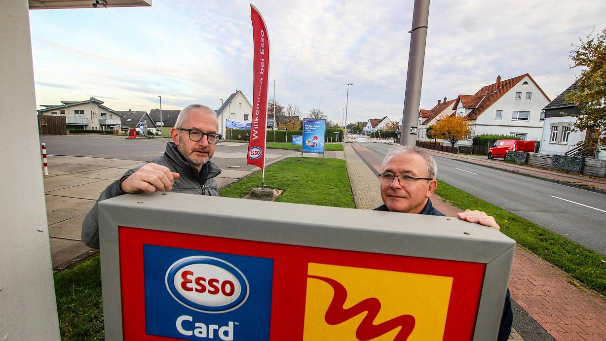 Ralf Gössel (links) und Tankstellenpächter Juan Arrebola fragen sich, warum die Arbeiten an der Baustelle an der Engerstraße noch nicht gestartet sind. | © Daniel Salmon