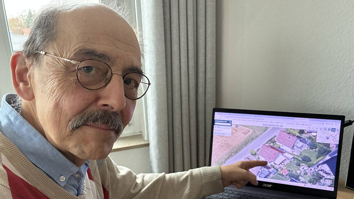 Der Herforder Axel Brinkmann zeigt auf ein Foto seines Hauses, das er gemeinsam mit seiner Frau an der Waldfriedenstraße gebaut hat. Nun soll er die Genehmigung für die Erdwärmeheizung ein zweites Mal einholen. | © Matthias Bungeroth