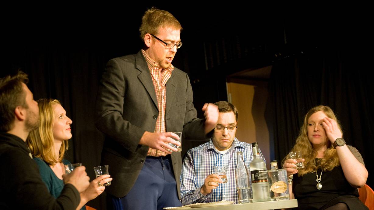 Integration beim Vodka: Die Verliebten (Christoph Schwerdtfeger, Anni Kolwes, l.) stellen den Deutschrussen Arthur (Henrik Franke) den Schwiegereltern (David Koch, Esther Gläsker) vor. Als die besoffen vom Stuhl kippen, zieht der ab - mit Säufern will er nichts zu tun haben. | © Ralf Bittner