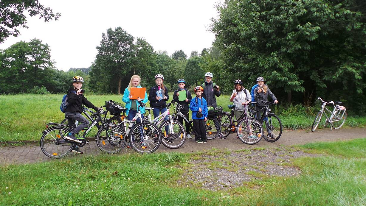 Startklar: Mit Fahrrad und Kamera erkunden Maximilian (v.l.), Tine, Celine, Nikita, Malte, Eva-Lotte Heine, Finja und Carolin die Gemeinde. | © Yvonne Gottschlich
