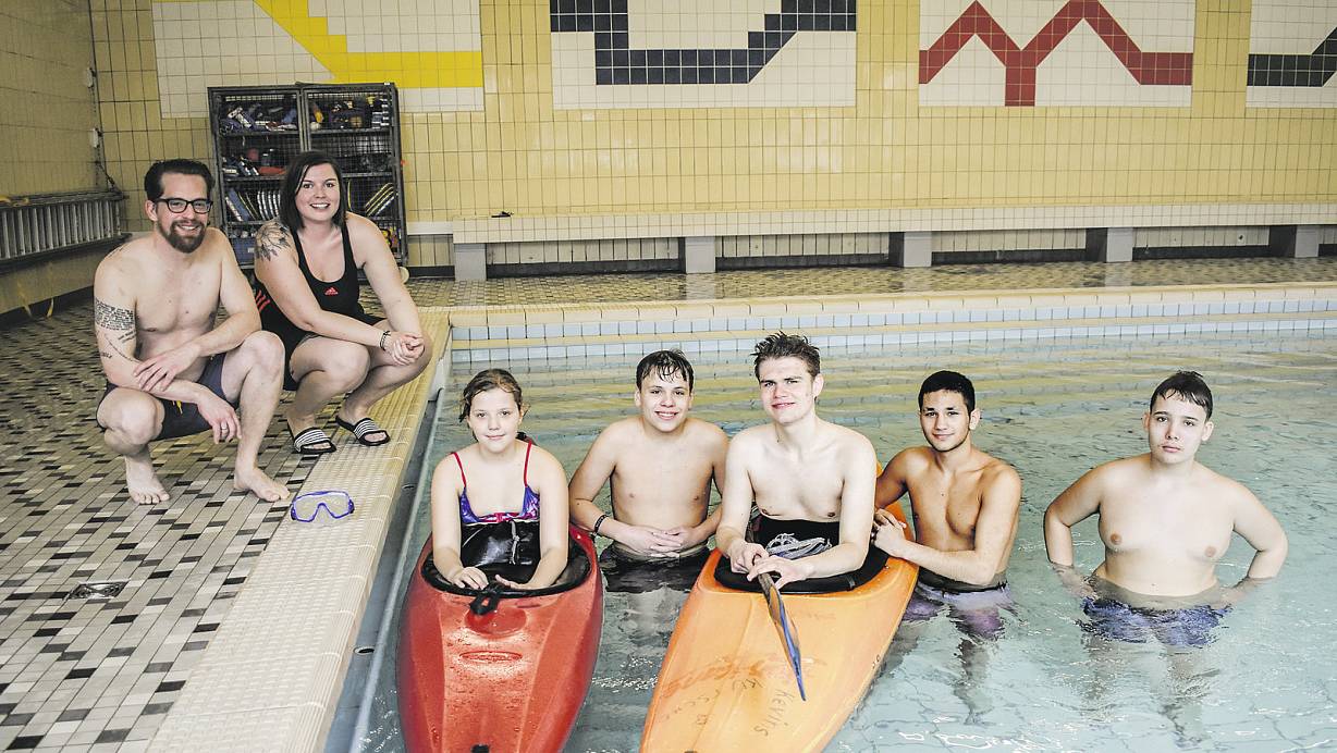 Im Training: Jan Sieker (l.) von der Eickhofschule und Judith Butenuth (2.v.l.) vom Johannes-Falk-Haus üben mit den Schülern Lennja Bleichert (v.l.), Dustin Weiding, Christian Napirella, Daniel Yunan und Alexander Lass das Fahren und Rollen mit dem Kajak. | © Mareike Köstermeyer