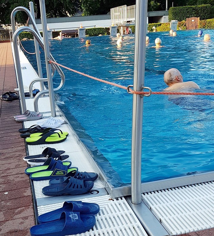 sich – und schwupp ist sie unter dem Tor durch zur Umkleide, weit vor den anderen. Und sie ist natürlich die erste im 26 bis 28 Grad warmen Wasser.