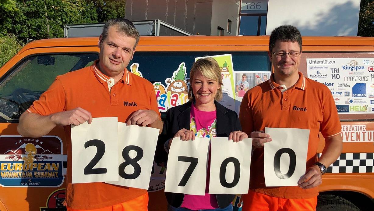 Fröhlich: Maik Wulfmeyer, Peggy Brammert von Fruchtalarm und René John (von links) freuen sich über die große Summe, die mit Hilfe von 23 Spendern für an Krebs erkrankte Kinder zusammengekommen ist. | © Alexander Jenniches