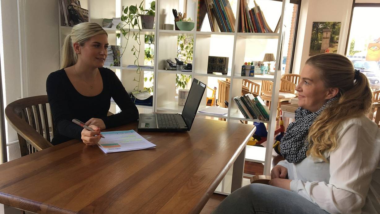 Sozialarbeiterin Nathalie Vossenkämper (l.) bespricht mit Janine Chahru wie es weitergeht. | © Sina Wollgramm