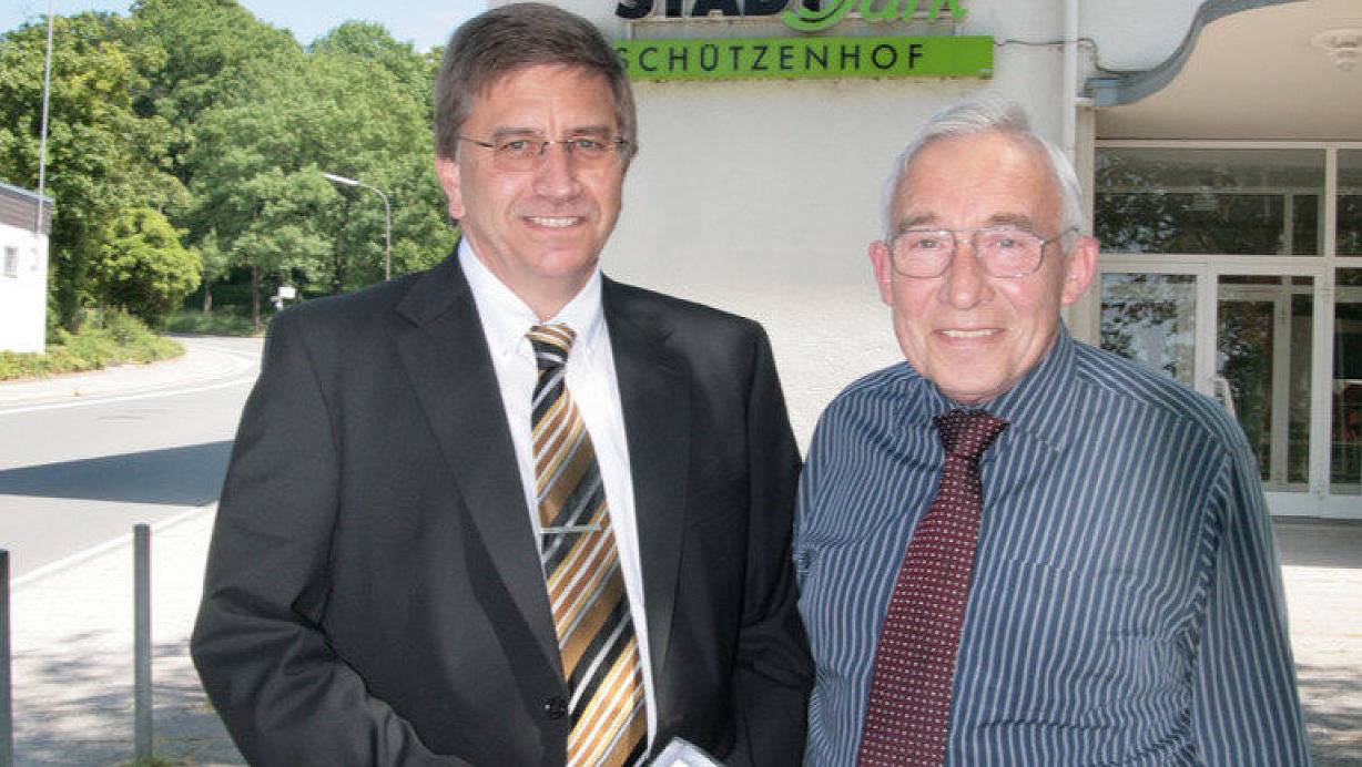 Friedrich-Wilhelm Generotzky (rechts im Bild, gemeinsam mit Dieter Wulfmeyer, 2012 vor dem Schützenhof) ist verstorben. | © Corina Lass