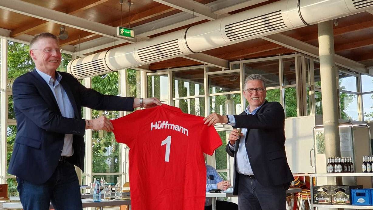 SPD-Kandidat Andreas Hüffmann bekam vom amtierenden Bürgermeister Ulrich Rolfsmeyer (SPD) auf der Delegiertenkonferenz ein T-Shirt überreicht mit besten Wünschen für den Wahlkampf. | © SPD Hiddenhausen