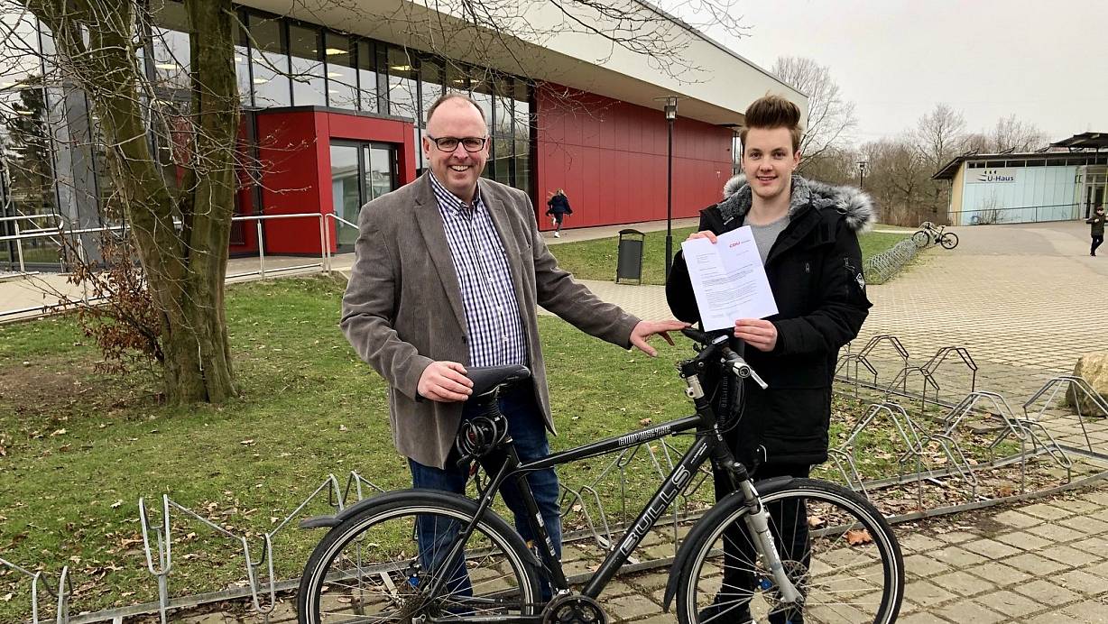 Marcus Söhnchen (links) als Fraktionssprecher von der Hiddenhausen CDU und Noel Schuppenat haben sich seit Anfang 2019 für den Fahrradständer an der OPG stark gemacht. | © Alexander Jenniches