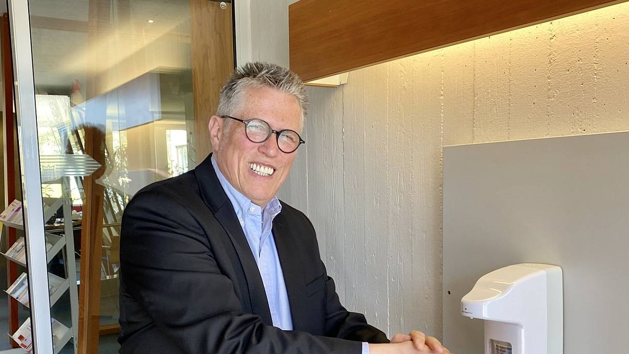 Als Bürgermeister hat Ulrich Rolfsmeyer auch eine Vorbildfunktion. In Zeiten von Corona desinfiziert er sich vor betreten des Rathauses die Hände. | © Alexander Jenniches (Archivfoto)