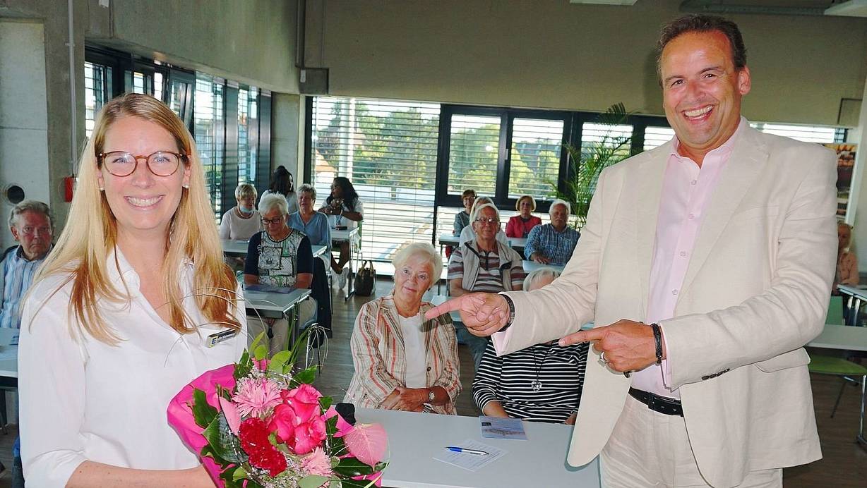 Christoph Rodermund bedankt sich bei Julia Wehrmann aus der Geschäftsführung des gleichnamigen Unternehmens für die Unterstützung während des Lockdowns und die Chance zum Reisevortrag in Wehrmanns Konferenzräumen in Eilshausen. | © Siegmund Bischoff