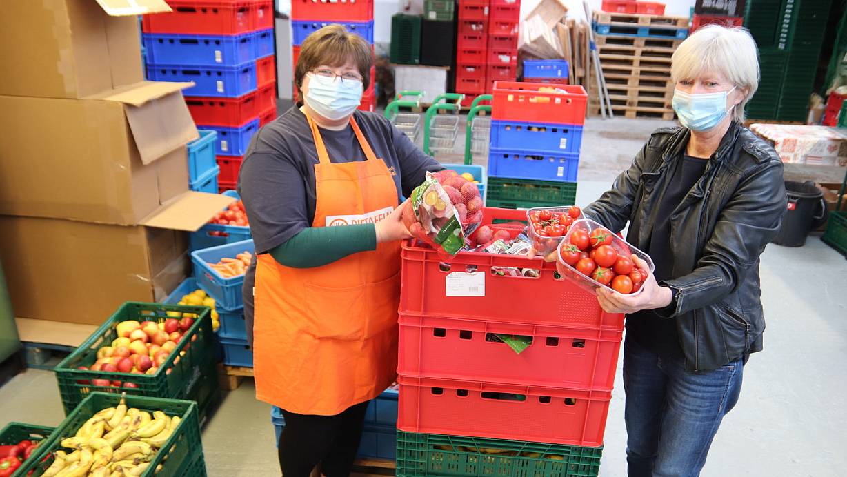 Die Angestellte Alla Pestov (links) und Vorsitzende Barbara Beckmann freuen sich über die vielen frischen Lebensmittel, die wegen den geschlossenen Gastronomiebetrieben momentan kaum gebraucht werden. | © Alexandra Golfinger