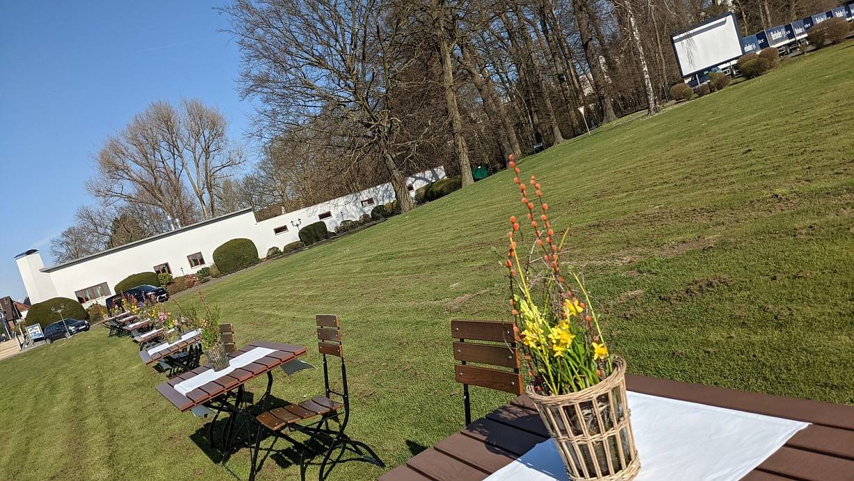 Ein stiller Protest, der wenig Raum für Interpretationen lässt: Vor der Herforder Wirtschaft in Sundern stehen zehn Tische, die daran erinnern sollen, dass es die Gastronomie noch gibt. | © David Knapp