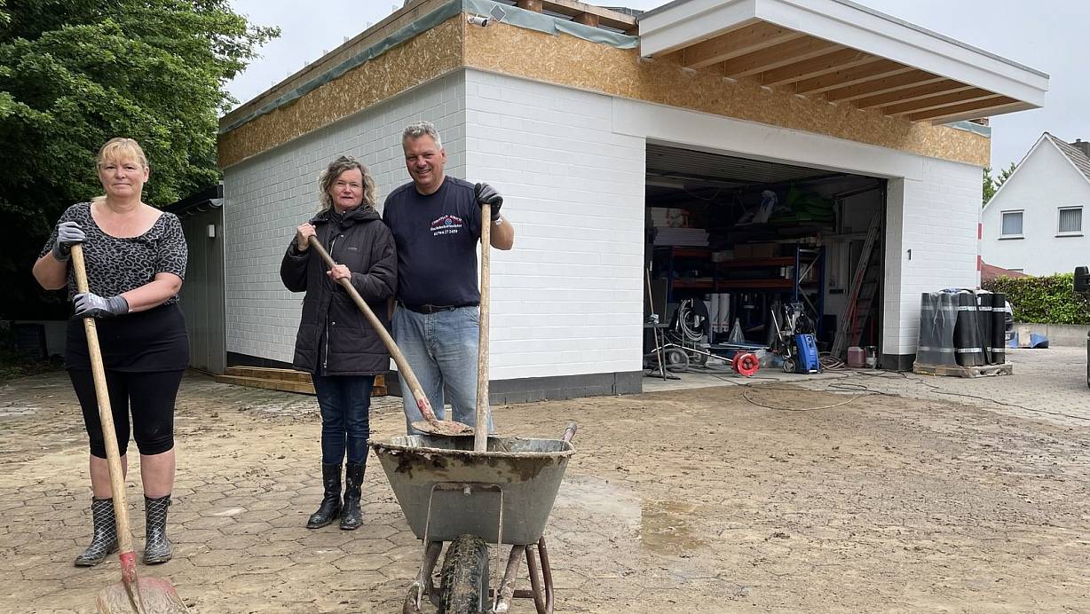 Susanne Konrad (v.l.), Anke und Christian Kirsch versuchen ihren Hof in Hiddenhausen vom Schlamm zu befreien. | © Benedikt Riemer