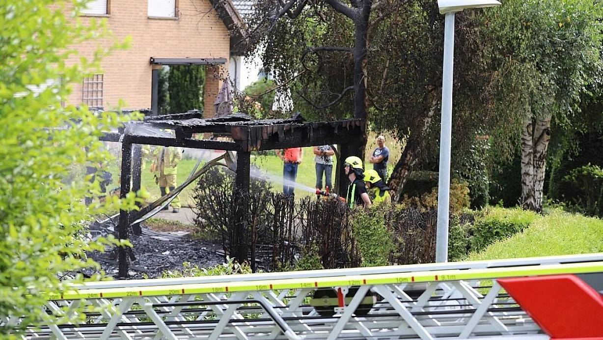Der Brandort am Sonntag. Ein Feuerwehrmann steht vor den verkohlten Resten des Carports. | © Charlotte Mahncke