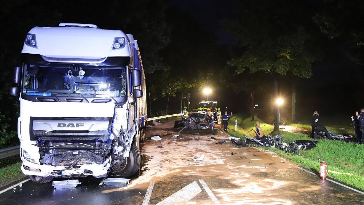 In einer Rechtskurve kommt es zu dem folgenschweren Zusammenprall eines Autos und eines Lkw. Ein Mann ist bei dem Unfall am Freitagabend verstorben.