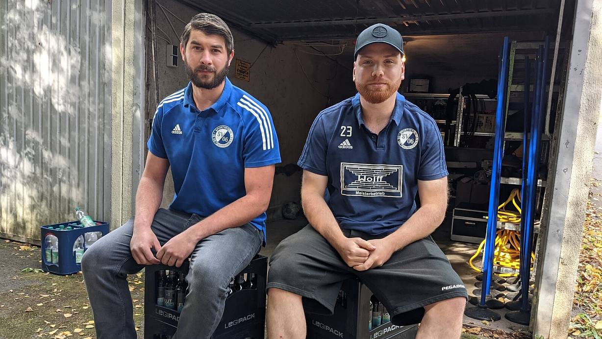 Patrick Laege (l.) und Jonas Meise vom SV 06 sitzen vor der leer geräumten Garage in Oetinghausen. | © David Knapp