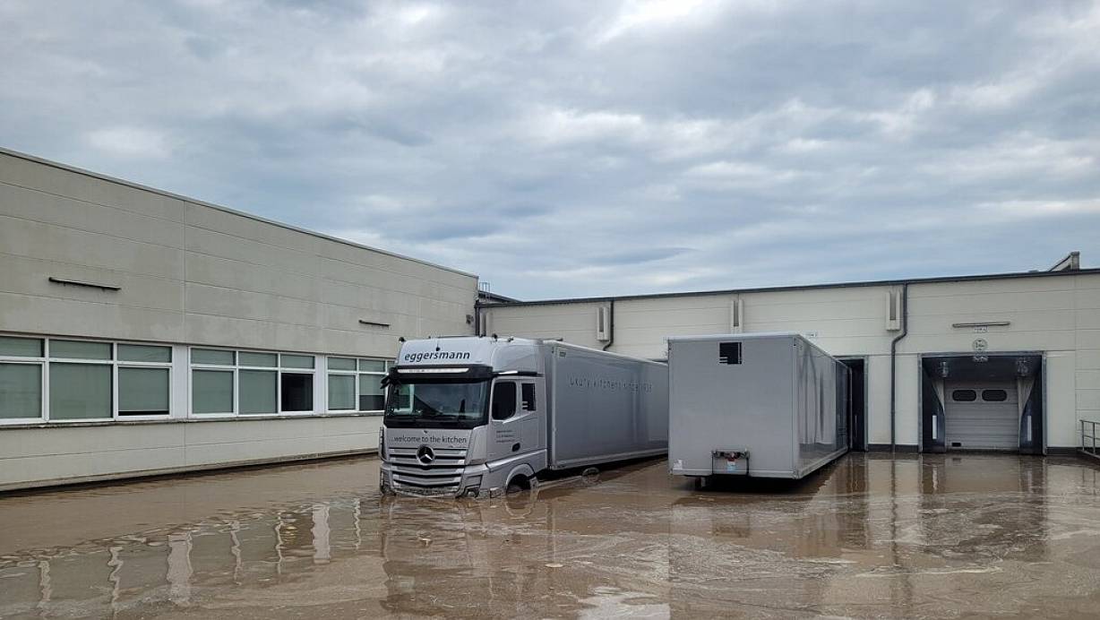 Die Laster der Firma Eggersmann in Schweicheln standen Freitagabend tief im Wasser. Der Feuerwehr zufolge stand das Wasser in der Lkw-Laderampe so hoch, dass es über die Tore in die Halle gelang. | © Feuerwehr Hiddenhausen
