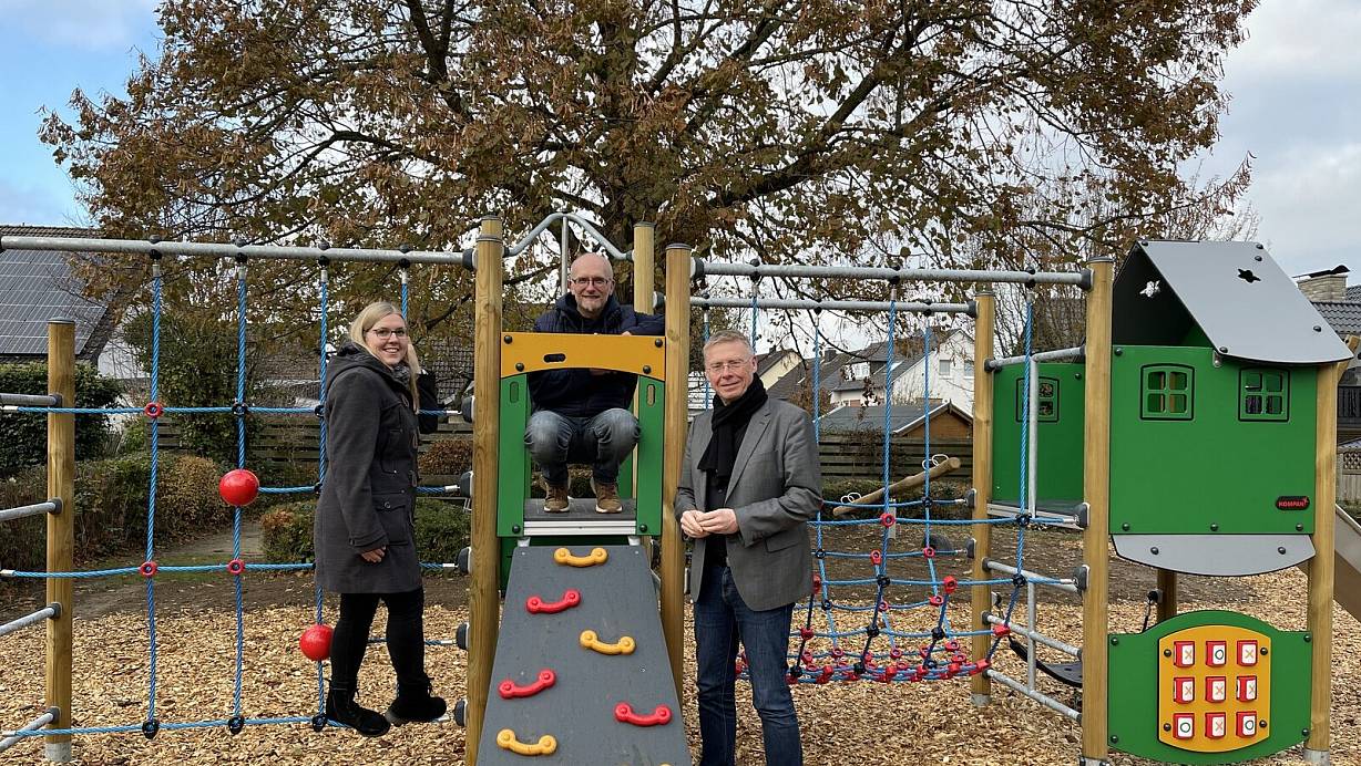 Sachbearbeiterin Daniela Gellert, Amtsleiter Uwe Schröder und Bürgermeister Andreas Hüffmann freuen sich über die Neugestaltung des Spielplatzes. | © Gemeinde Hiddenhausen