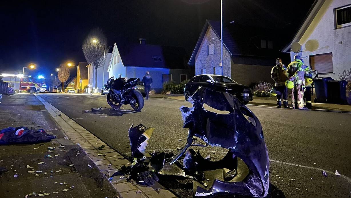 Das zerstörte Motorrad des 23-Jährigen steht auf der Oberen Talstraße. Gegen den Mann wurde jetzt Anklage erhoben. | © Christian Müller/Westfalennews/dpa