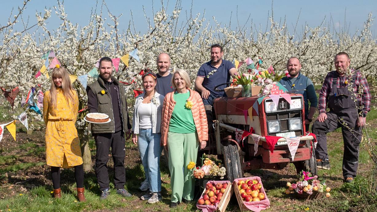 Charlotte Otte (3. v. l.), ihre Mutter Hanna Otte (M.) und das Team vom Obsthof Otte bereiten sich auf ein buntes und sonniges Obstblüten-Fest am 1. Mai vor. | © Ralf Bittner
