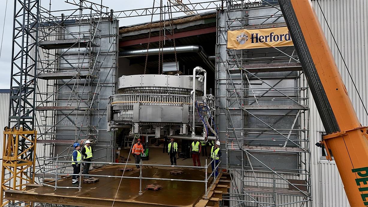 Maßarbeit: Durch das große Loch im Gebäude wird die Etikettiermaschine an ihren Bestimmungsort gebracht. | © Herforder Brauerei