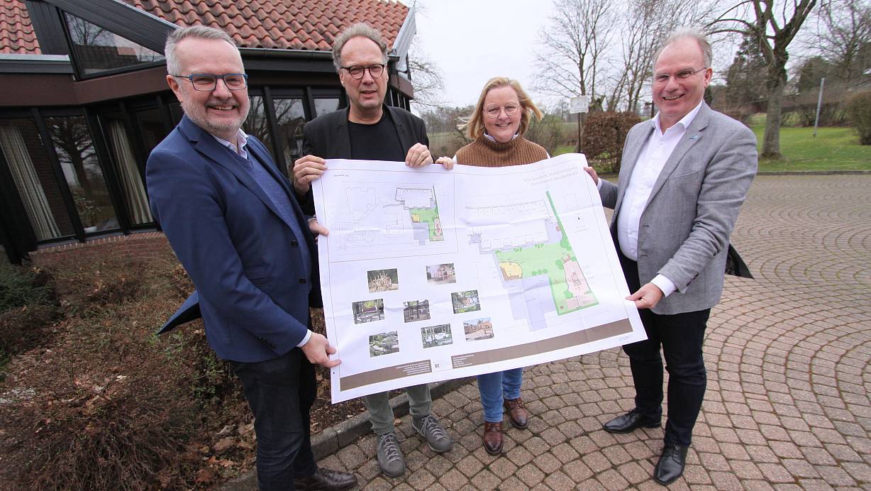 Olaf Reinmuth, Jörg Lange, Martina Kechlo und Kai-Uwe Spanhofer präsentieren die Planung für die neue Kita in Sundern. Voraussichtlich im Sommer sollen die Bauarbeiten beginnen. | © Björn Kenter