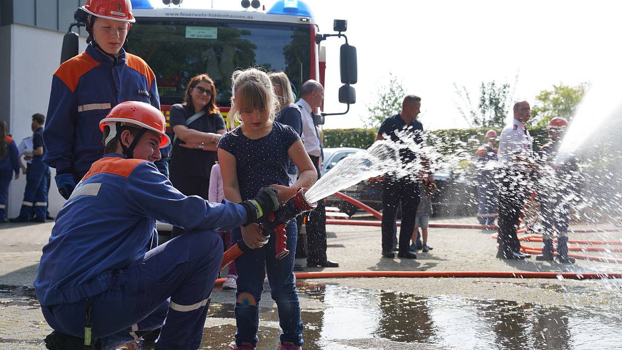 Die Helfer von der Jugendfeuerwehr zeigen den Jüngsten wie sie den Schlauch festhalten. Hier probiert sich Clara aus. | © Yvonne Gottschlich