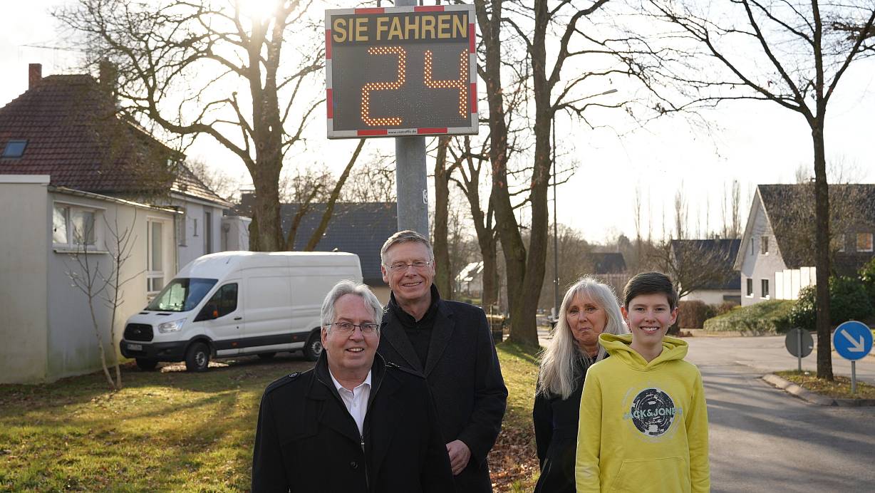 Der 14-Jährige Julian Arndt freut sich, dass sich sein Einsatz für ein Geschwindigkeitsdisplay und einen mobilen Blitzer an der Milchstraße gelohnt haben. Das sehen auch Landrat Jürgen Müller (links), Bürgermeister Andreas