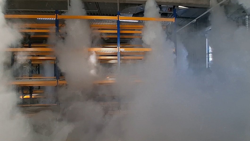 Weiße „Nebelsäulen“ strömen mit lautem Zischen aus den Düsen an der Hallendecke. Da Kohlendioxid schwerer ist als die Umgebungsluft, sinkt das Gas schnell zu Boden. Binnen weniger Sekunden ist die komplette Halle eingenebelt. „Wir können die Hand nicht mehr vor Augen sehen“, meldet Feuerwehrmann Nicholas Jost per Funk aus dem Inneren der Halle. „Etwa 1,6 Tonnen CO2-Gas sind ausgeströmt“, sagt ein Johnson-Controls-Mitarbeiter.