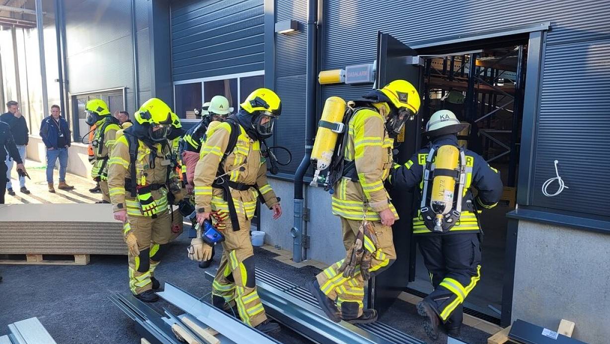 Oliver Stratmann, Sicherheitsbeauftragter bei Peter-Lacke, übernimmt die Einweisung der Feuerwehrleute. „Ich hoffe, die CO2-Löschanlage geht heute das erste und einzige Mal in Betrieb“, sagt der Chemietechniker. Gegen 17.15 Uhr rüsten sich fünf Trupps mit Atemschutzgeräten, Funkgeräten und Wärmebildkameras aus. Sie positionieren sich anschließend im Inneren der Halle zwischen den Hochregalen und auf einer Empore, die für die Waren-Kommissionierung gedacht ist.