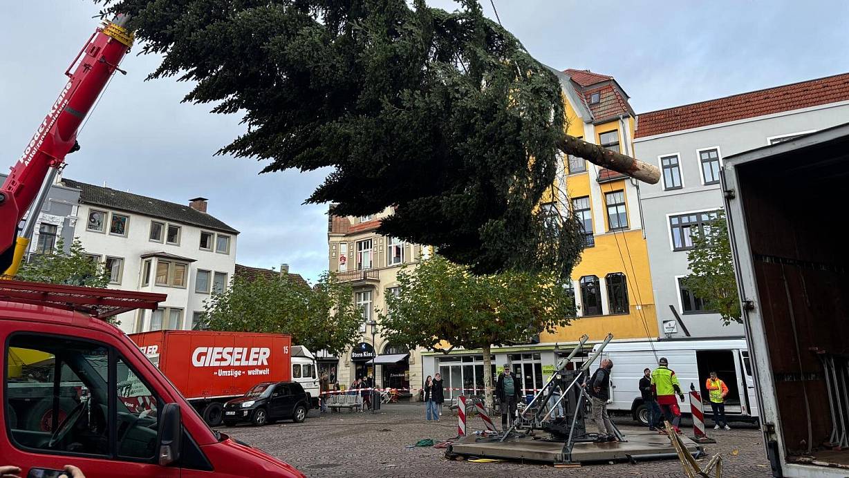 2025 ziert eine XXL-Tanne aus Hiddenhausen die „Ravensberger Himmelspforte“ in der Herforder Innenstadt. Kornelia Sudmann hat ihn gespendet.