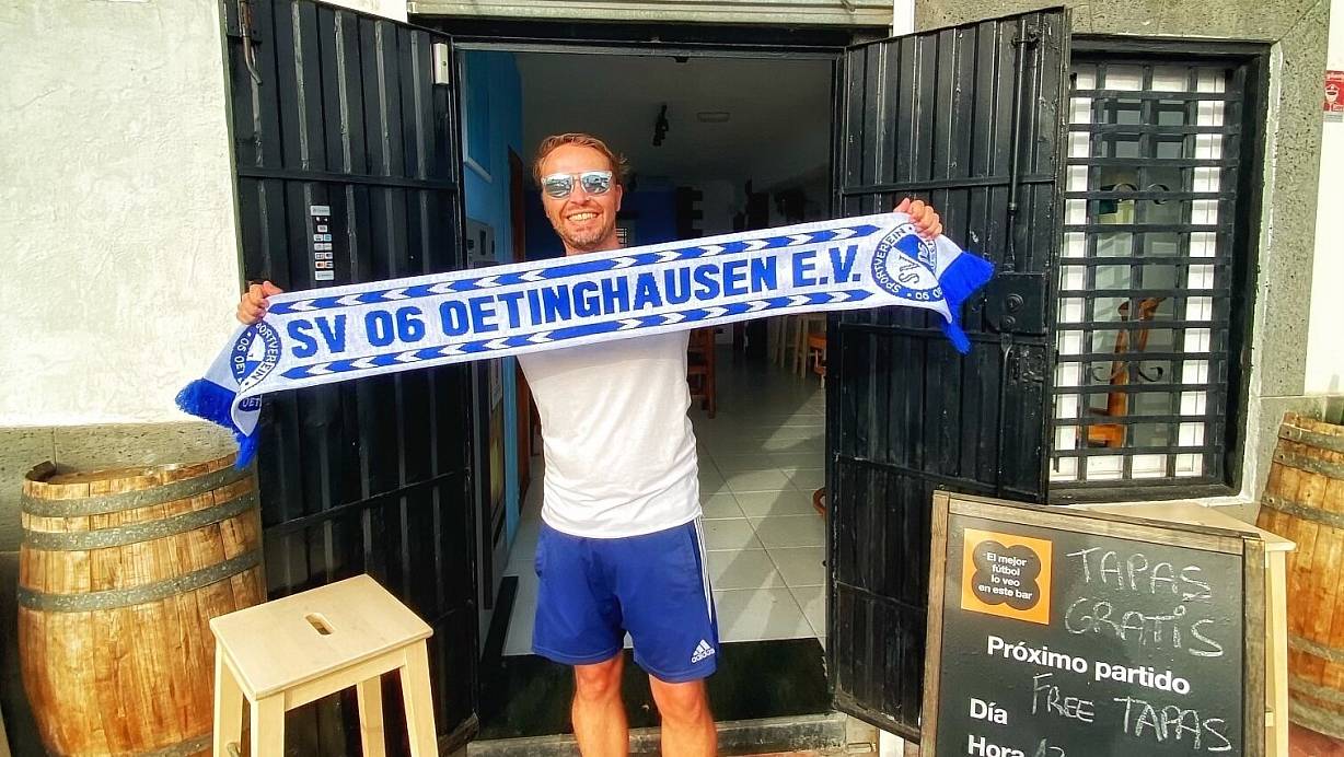 Auch in 4.000 Kilometer Entfernung mit dem Herzen dabei: Pascal Steffen aus Hiddenhausen lebt auf Lanzarote, hat aber immer noch den Oetinghauser Fanschal. Hier steht er vor der Bar seiner Freundin Melani. | © Pascal Steffen