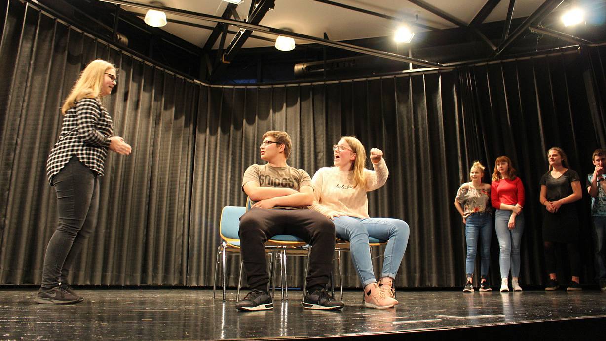 Die Theaterpädagogen Alix Heselhaus und Andreas Strietzel aus Münster waren über 10 Jahre selbst Teil einer Improvisationsgruppe und geben jetzt gemeinsam Workshops. Für die Vorstellung am Abend probten die Pädagogen vier Stunden mit den Mädchen und Jungen des 9. Jahrgangs. "Alle haben sehr gut mitgearbeitet, es hat sehr viel Spaß gemacht", sagt Alix Heselhaus. Die 34-Jährige betont, dass es wichtig sei, spontan und offen gegenüber der Situation zu sein. "Es stärkt auch das Selbstbewusstsein, bringt Spaß und hilft auf andere einzugehen und nicht so egoistisch zu sein."