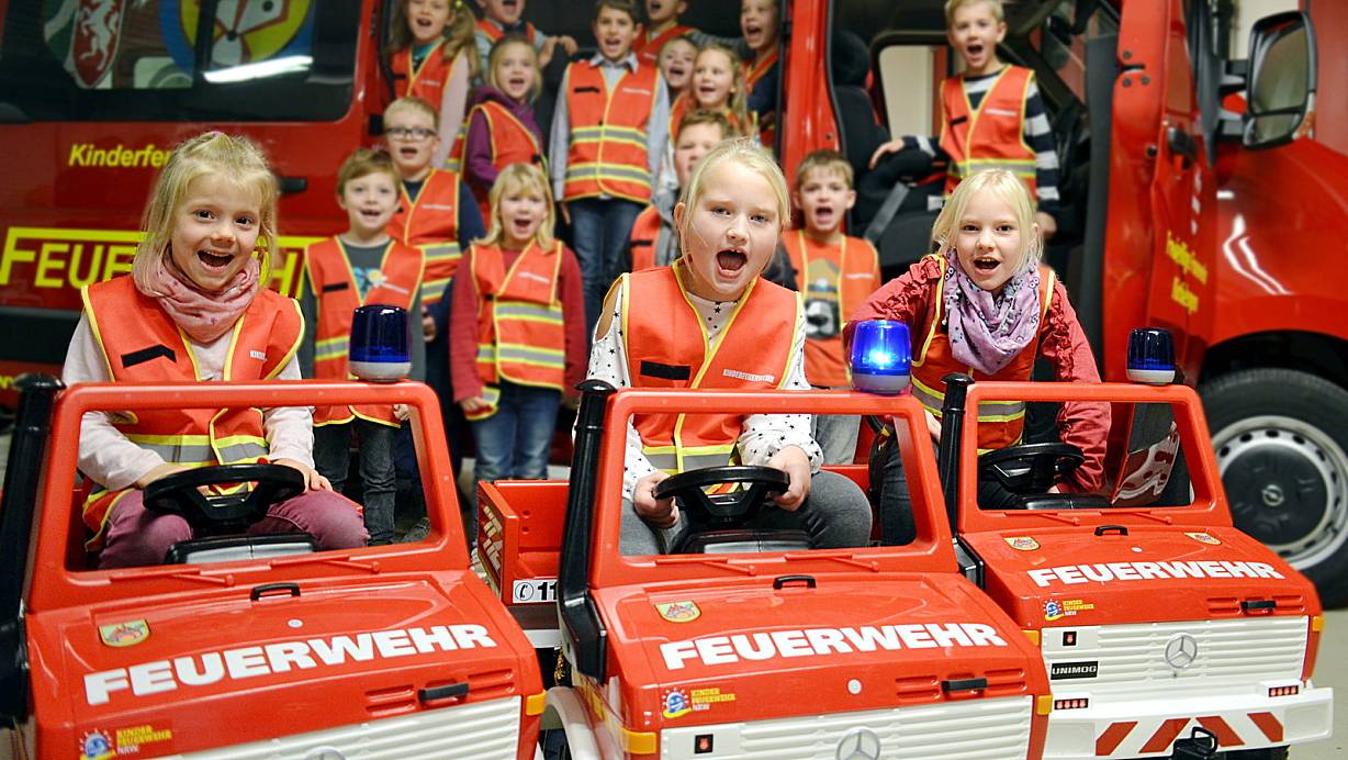 FEUERFÜCHSEEEEE! Laut rufen die rund 20 Kinder den neuen Namen der Kinderfeuerwehr in Richtung Fotografin. Sie gehören zu den ersten Mitgliedern der neuen Abteilung der Freiwilligen Feuerwehr Kirchlengern. | © Katharina Eisele