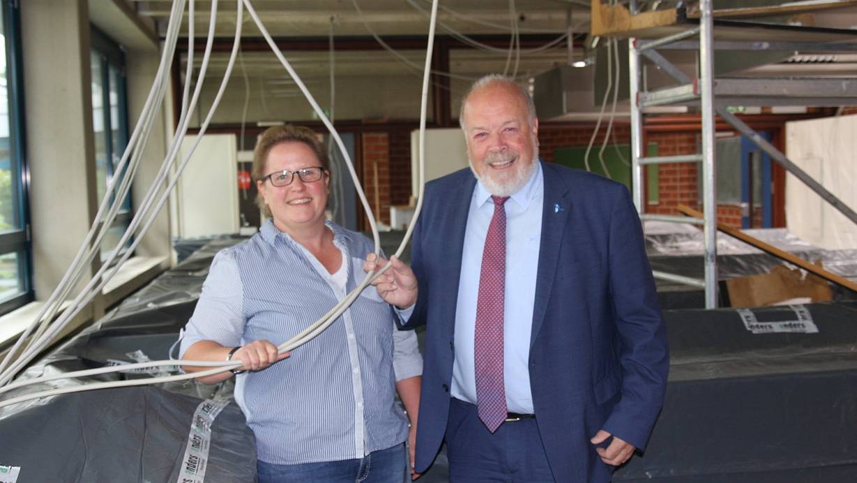 Im Zuge der energetischen Sanierung werden nun auch Teile des Erdgeschosses mit der neuen Beleuchtung ausgestattet – insgesamt neun Klassen- und Gruppenräume fallen in diesen Bereich. Neben der optimierten Beleuchtung wird hier zudem die Elektroinstallation saniert sowie der Brandschutz den neuesten Standards angepasst. Auch die Schulküche ist Bestandteil der Arbeiten. „In der Lehrküche wird ein Großteil der Elektrik erneuert. Manche Leitungen, wie die der Dunstabzugshauben, sind allerdings noch sehr neu und können bleiben", berichtet Freudenreich. Sie freut sich besonders, dass zwei der am Umbau beteiligten Baufirmen aus Kirchlengern stammen.