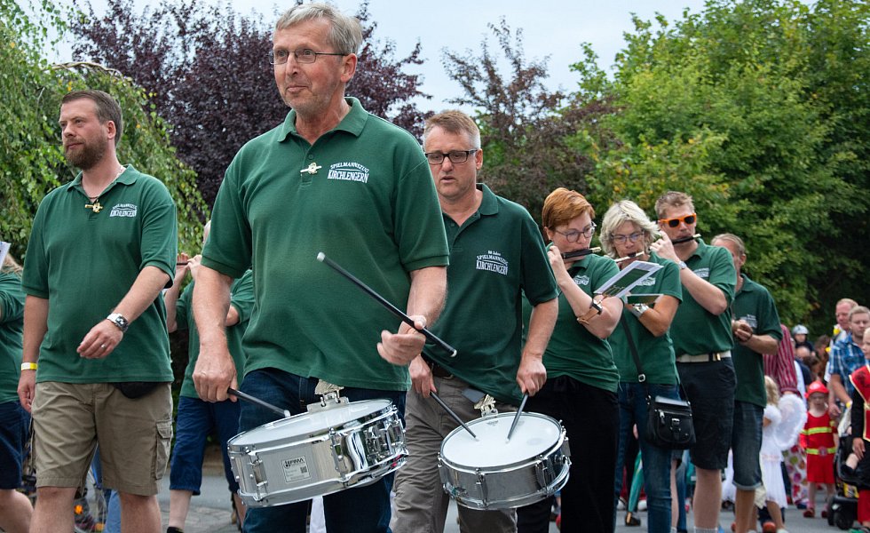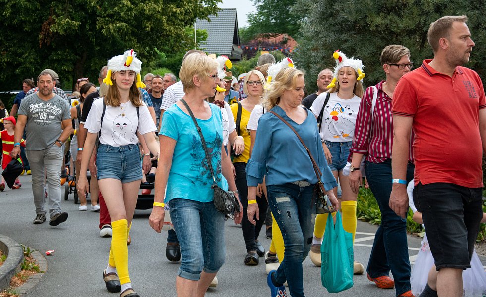 Kirchlengern. Mit Trommeln, Flöten und Holzschuhen eröffnete der Spielmannszug Kirchlengern am Freitagabend das Feuerwehrfest in Südlengern. Die Gruppe startete am Maibaum und wanderte mit rund 100 anderen Holzschuhträgern auf dem Schimmelkamp in Richtung Festplatz. An der Grundschule Südlengern angekommen, marschierte der Umzug in das große Festzelt.
