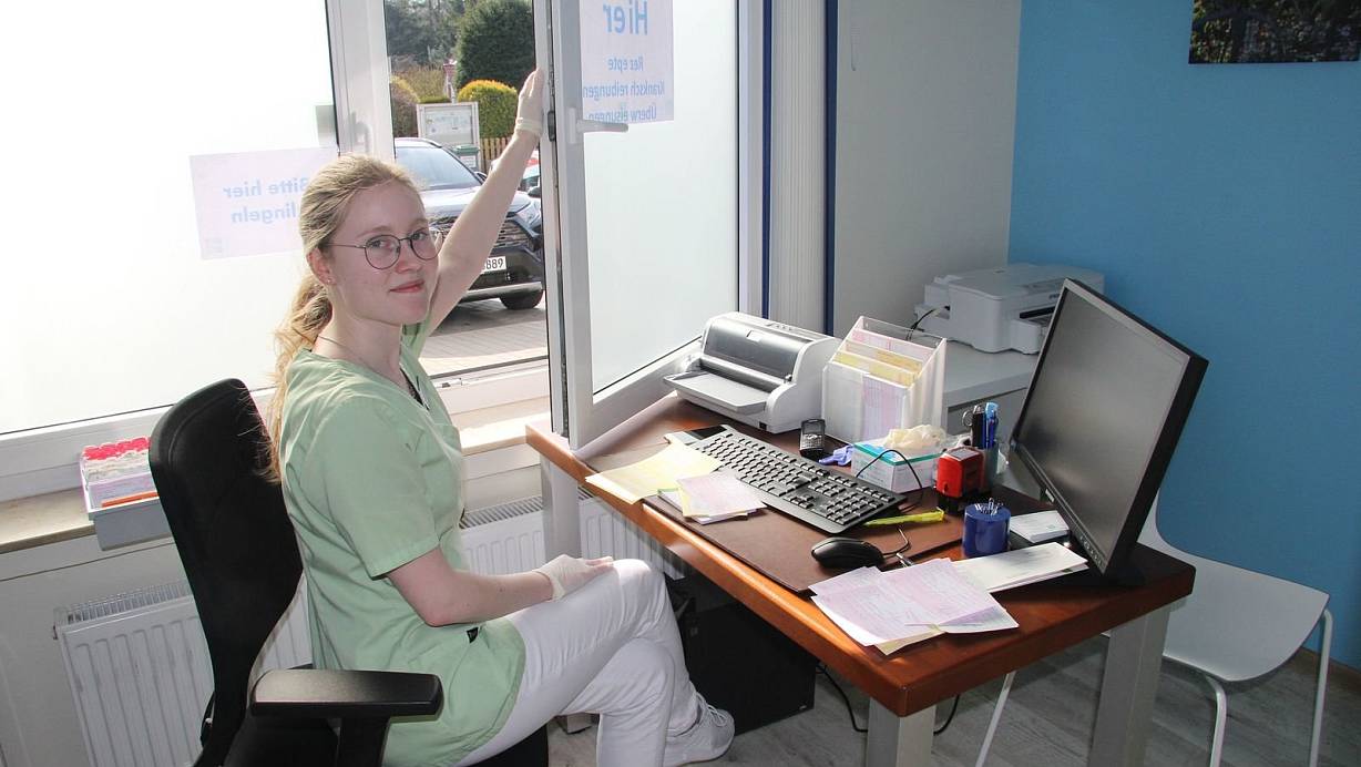 Michelle Batterton spricht durch ein geöffnetes Fenster mit Patienten von Hausarzt Peter Weitkamp in Kirchlengern, die Überweisungen oder Rezepte benötigen. | © Carolin Nieder-Entgelmeier