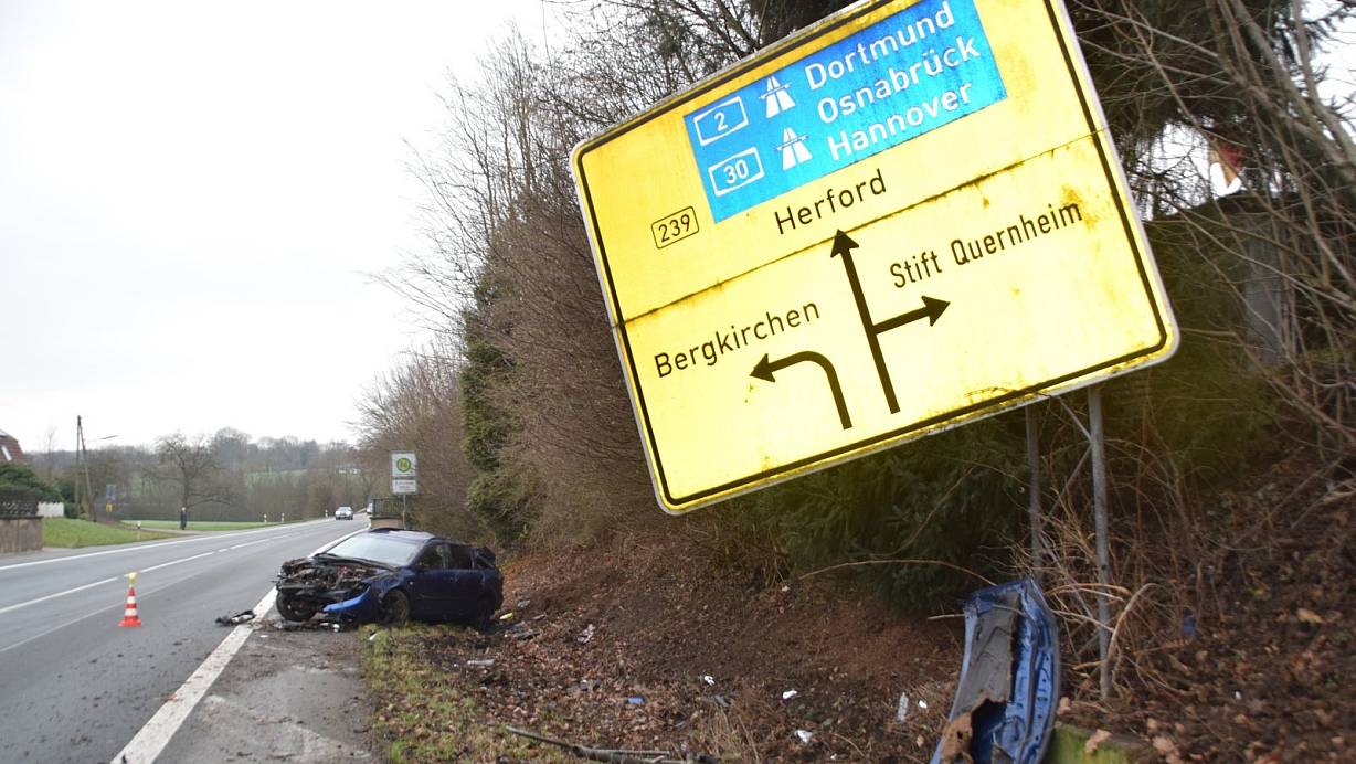 Mit seinem Mazda ist ein Autofahrer in Kirchlengern von der B239 abgekommen und gegen ein Schild gekracht. Nur kurz nach seiner Flucht vom Unfallort fand die Polizei den alkoholisierten Fahrer auf.