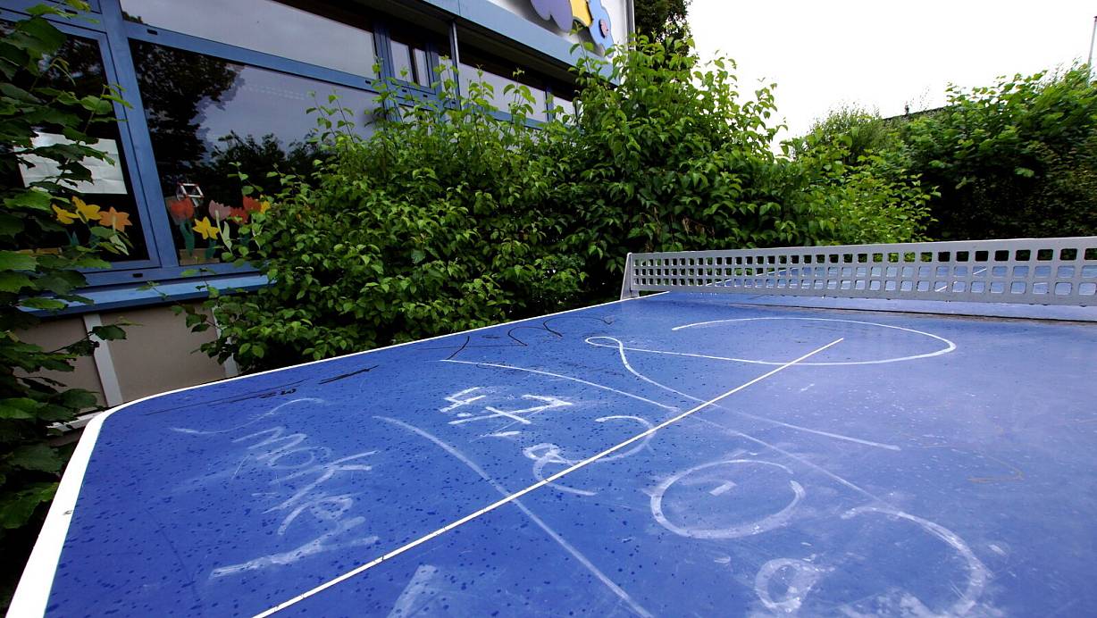 Auf einer Tischtennisplatte auf dem Schulhof der Grundschule Kirchlengern wurden Schmierereien hinterlassen. | © Niklas Krämer