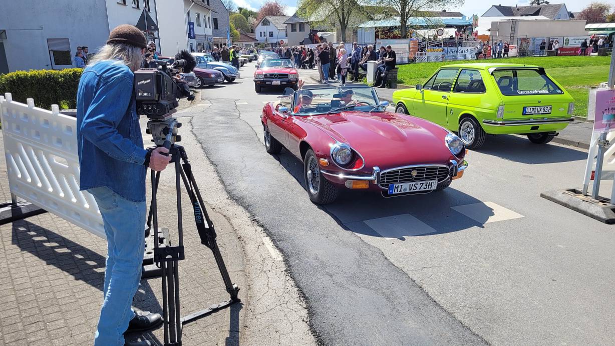 Zahlreiche Auto-Fans sind mit ihren Schätzen nach Stift Quernheim gekommen. Hier winken zwei Oldtimer-Freunde dem Filmemacher Norbert Kaase in die Kamera. | © Florian Weyand