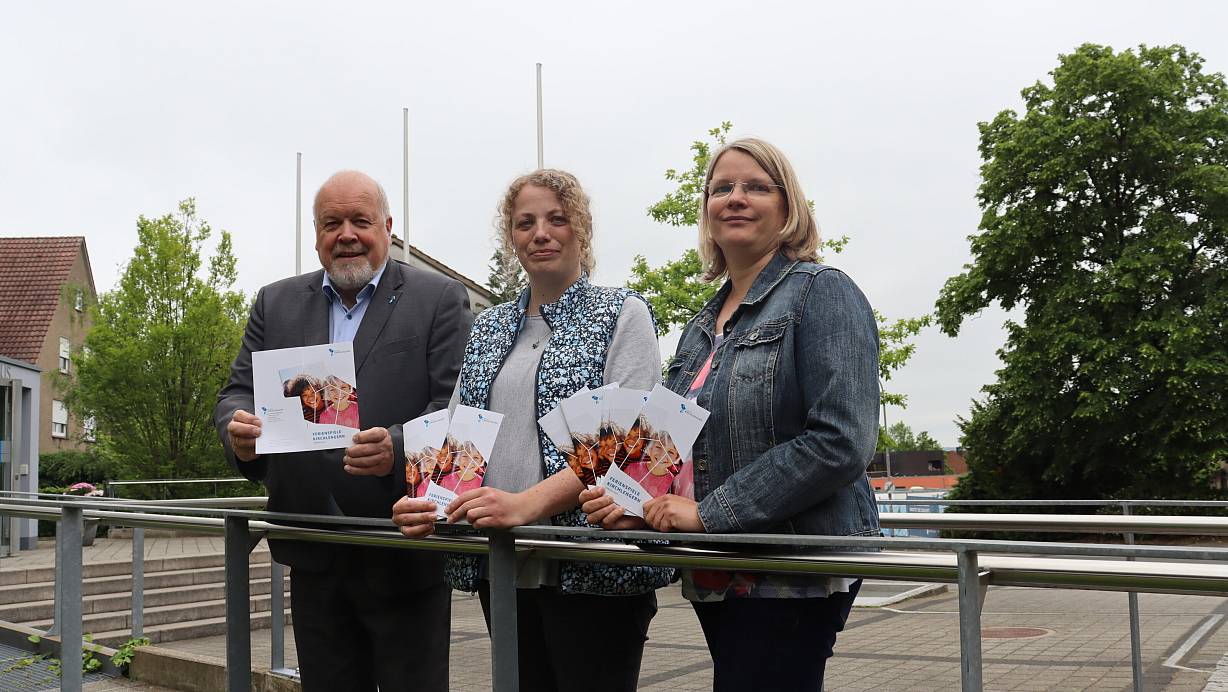 Bürgermeister Rüdiger Meier, Jugendreferentin Tina Obermeier und Christine Schmidt von der Gemeinde Kirchlengern präsentieren das Programm für die Ferienspiele. Angebote gibt es in den Bereichen Kunst, Musik und Sport. | © Jenny Westhues