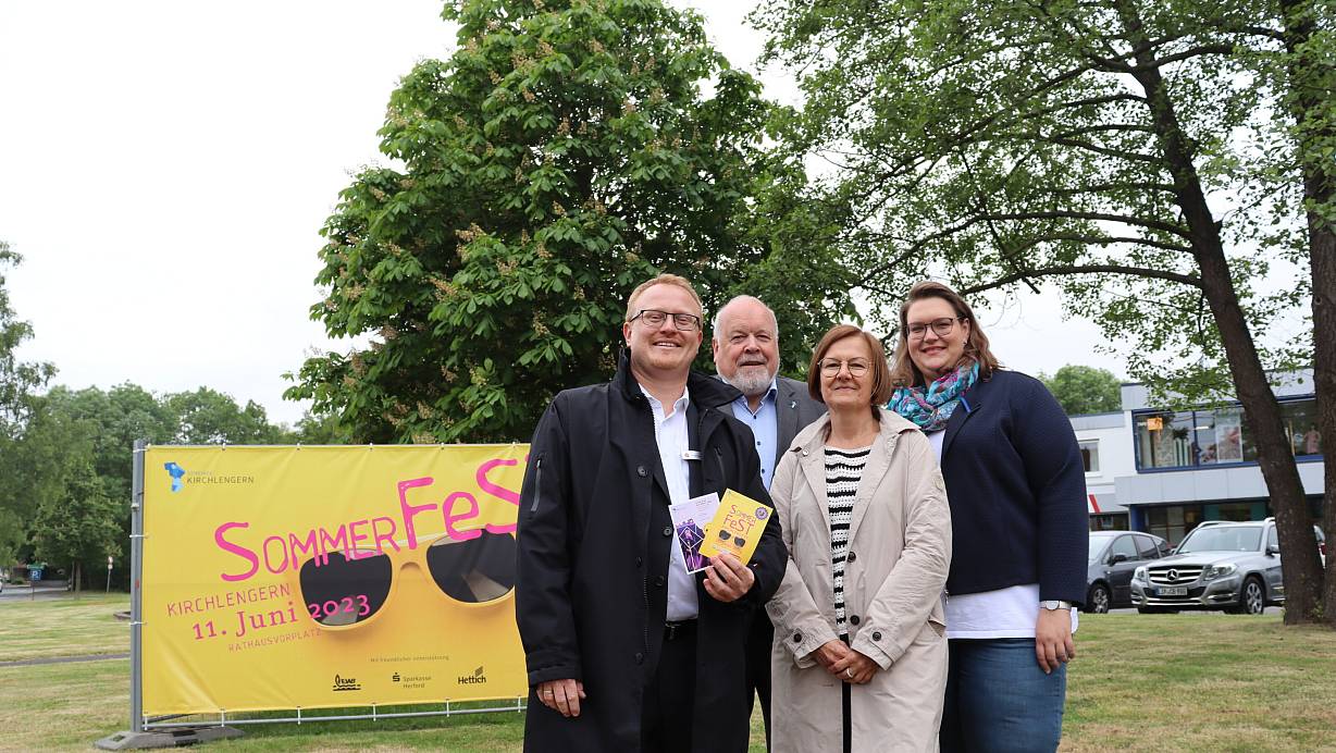 Gregor Burejza von der Sparkasse Herford, Bürgermeister Rüdiger Meier, Martina Stallmann von der Gemeinde Kirchlengern und Anke Sundermeier von der EWB freuen sich auf viele Besucher auf und um den Rathausvorplatz. | © Jenny Westhues