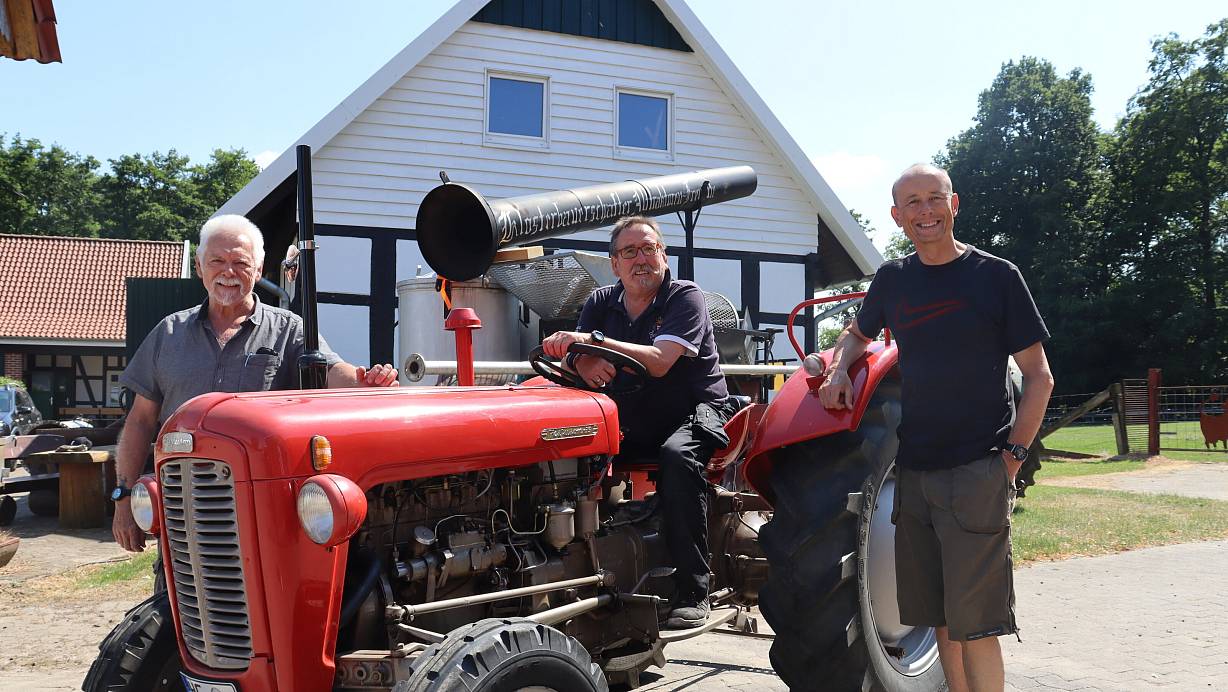 1. Vorsitzender Fred Eikötter, 2. Vorsitzender Achim Becker und Vorstandsmitglied Dirk Lütkemeier geben einen kleinen Einblick in das Programm. Hier zu sehen: Ein Ferguson Traktor, Baujahr 1959 mit 35 PS. | © Jenny Westhues