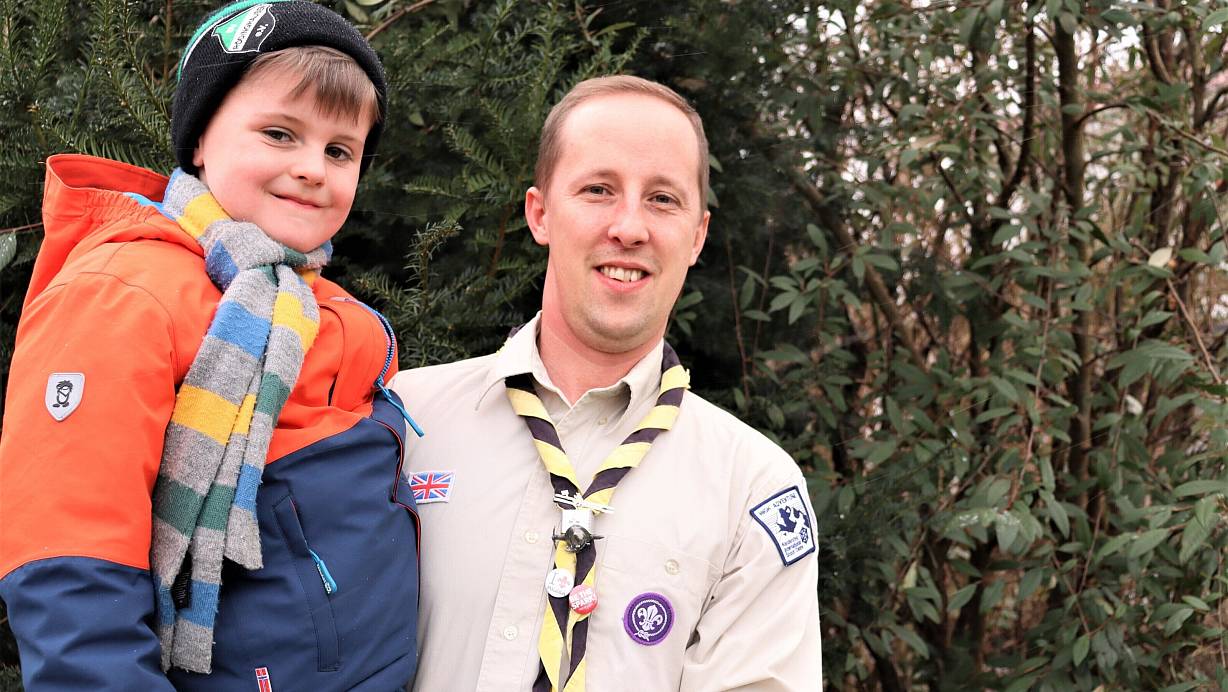 Robin Tough mit seinem Sohn James, der auf jeden Fall bei den Pfadfindern mitmachen wird. Die Uniform, die sein Vater trägt, stammt noch aus dessen früheren Pfadfindertagen. | © Meiko Haselhorst